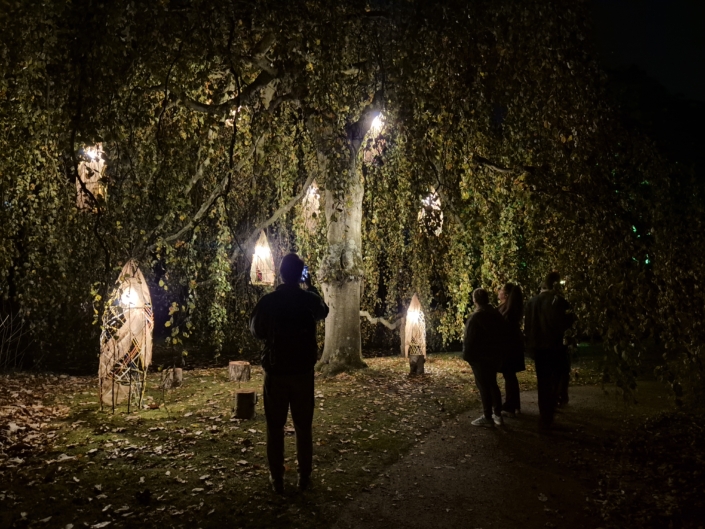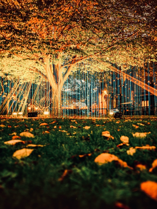 My light installations create an oasis of tranquility in the vibrant atmosphere of a light festival. By stringing wires between the branches of a tree and the ground, and between trees, a space is created that visitors can walk into. They become part of a play of light reflected on the strings. Some experience the relaxation of a meditative moment, others a fairytale-like effect filled with wonder.