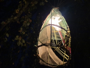 The beautiful weeping beech, already an intimate place as such, transformed in a very serene space. The light objects playfully hanging, illuminate the branches from below.