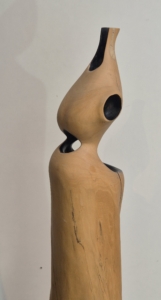 Een vrouwfiguur/torso gemaakt van een stam van een vlier, waarbij ik de imperfecties van het hout gebruikt of zelf imperfecties toevoeg. Verdiepte delen van de figuur maakte ik donker met zwarte verf, wat de vorm versterkt. Geaard, gesloten en open, licht en opgaand.